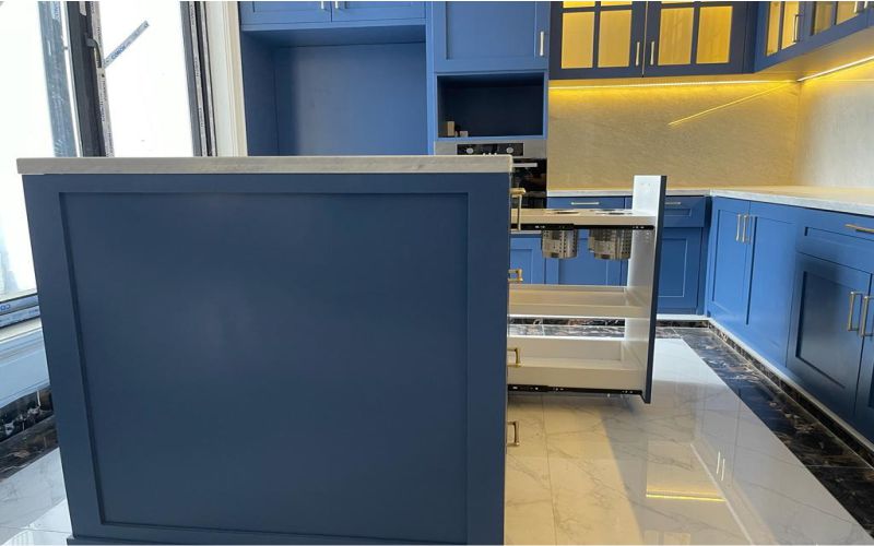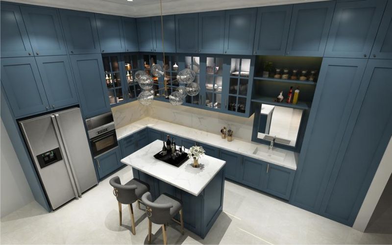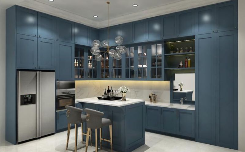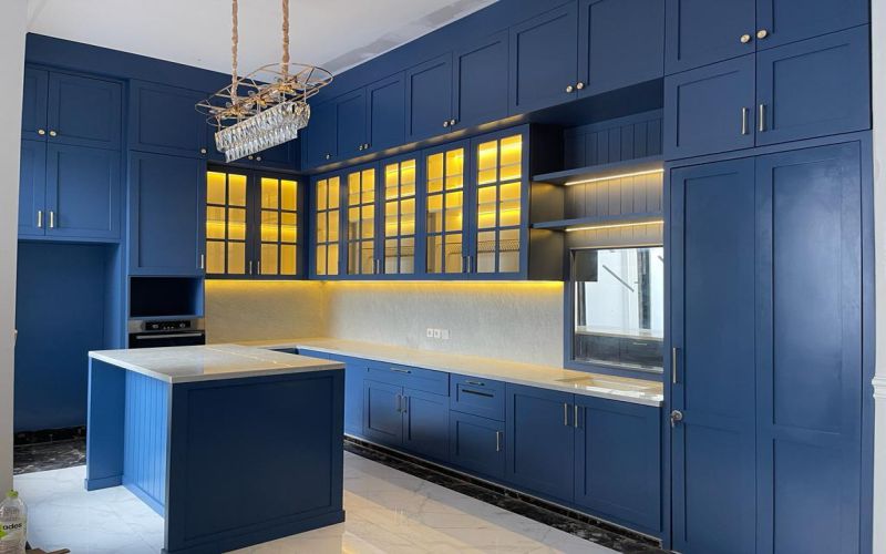 Kitchen set dengan gaya Design Interior Modern warna dominan biru dengan Pencahayaan Hangat (Warm Lighting Temperature), Warna biru adalah salah satu warna primier yang masuk ke dalam golongan Cool Color, selain itu Biru memberikan efek psikologi Smart, Intelejen, Loyal dan kedamaian, selengkapnya silahkan baca Memahami psikologi warna untuk suatu ruangan.