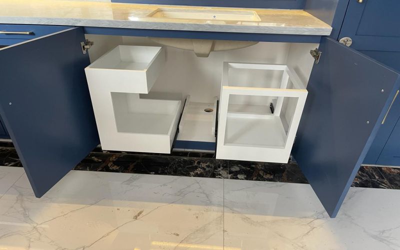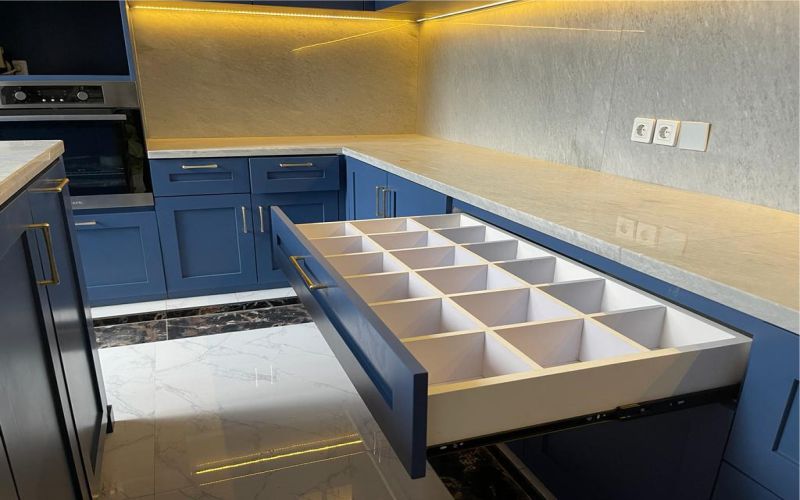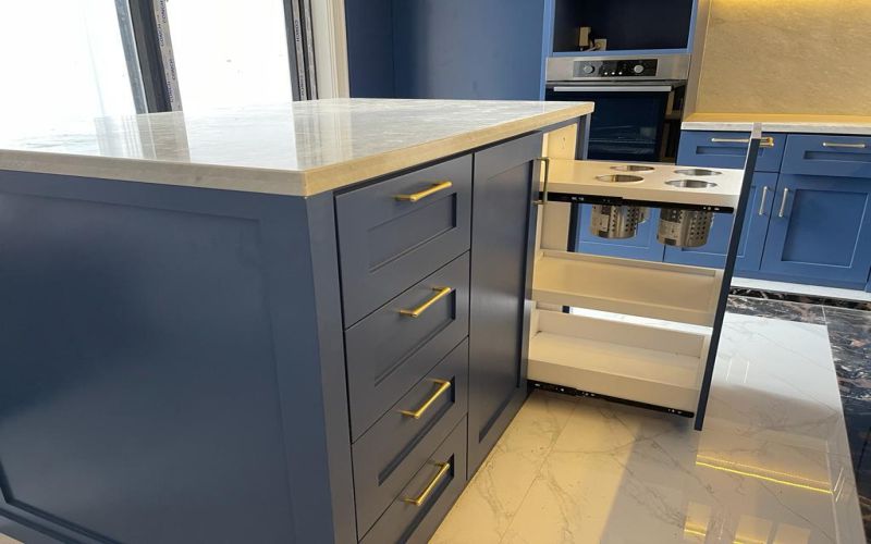 Dalam ruangan ini anda akan melihat Kabinet dengan laci dan ruang penyimpanan yang sangat banyak, cocok untuk kitchen yang ditargetkan untuk dapat dipergunakan untuk mengorganisir berbagai macam kebutuhan kitchen, mulai dari bahan masakan, bahan untuk baking, perlengkapan memasak dan perabotan, buku masakan dan lain sebagainya. dengan susunan kabinet yang banyak anda akan lebih mudah untuk mengorganisir semua itu, selengkapnya silahkan baca Kenapa Kitchen / Dapur harus diDesign.
